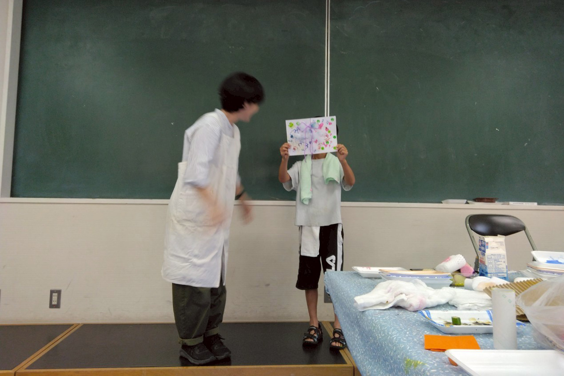 7月は、図書館でサニー文庫が所属するながこれん(長岡京市文庫連絡会)の講習会。【mybookを作ろう!】がありました。家ではできないようなことを体験してもらいたい、と野菜の端っこ・プチプチ・毛糸・段ボール・植物・と絵の具を用意してぺたぺたスタンプしたり、自分の手をぺたんとしたり。付き添っているお母さんも童心に帰って、新聞紙に野菜をスタンプしておられて“楽しいですね。”と笑顔。出来上がったmybookの一冊を(Rくんの許可を得て)みんなの前で披露すると、私のも見てほしい!と、手にmybookを持った子ども達の行列が!一人ずつお名前を聞いて披露させていただき、みんなの誇らしい表情がとても可愛い発表会になりました。ご家族の皆様も楽しんでくださっていて、私達も嬉しい講習会でした。ご参加くださった皆さま、ありがとうございました☺